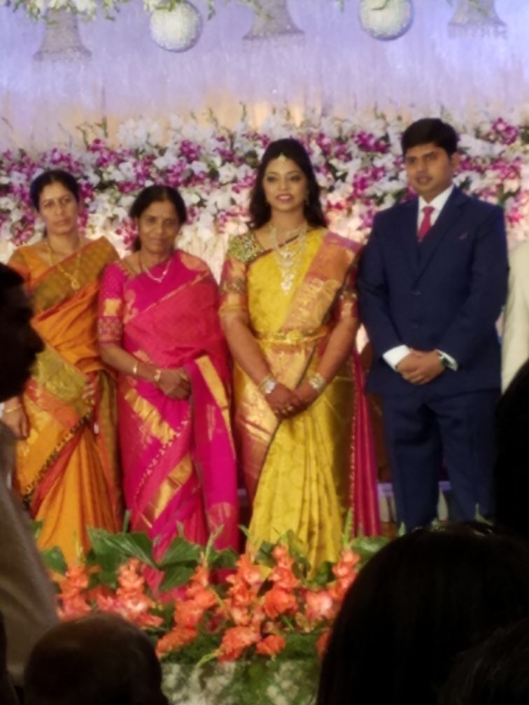The bride and groom flanked by family.