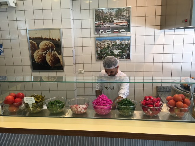The assembly line for falafel sandwiches at Aboulziz.