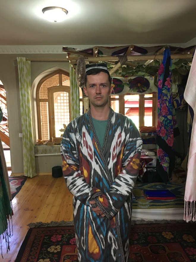 Jeff looking like a grim Russian in his ikat outfit.