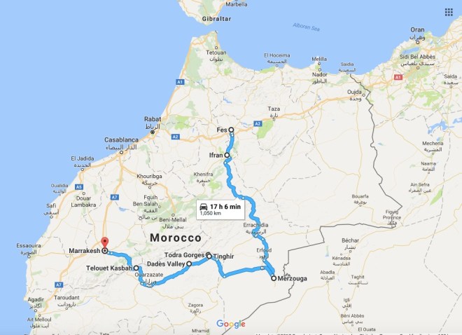 Our road trip route from Fez to Marrakech via the Atlas Mountains.